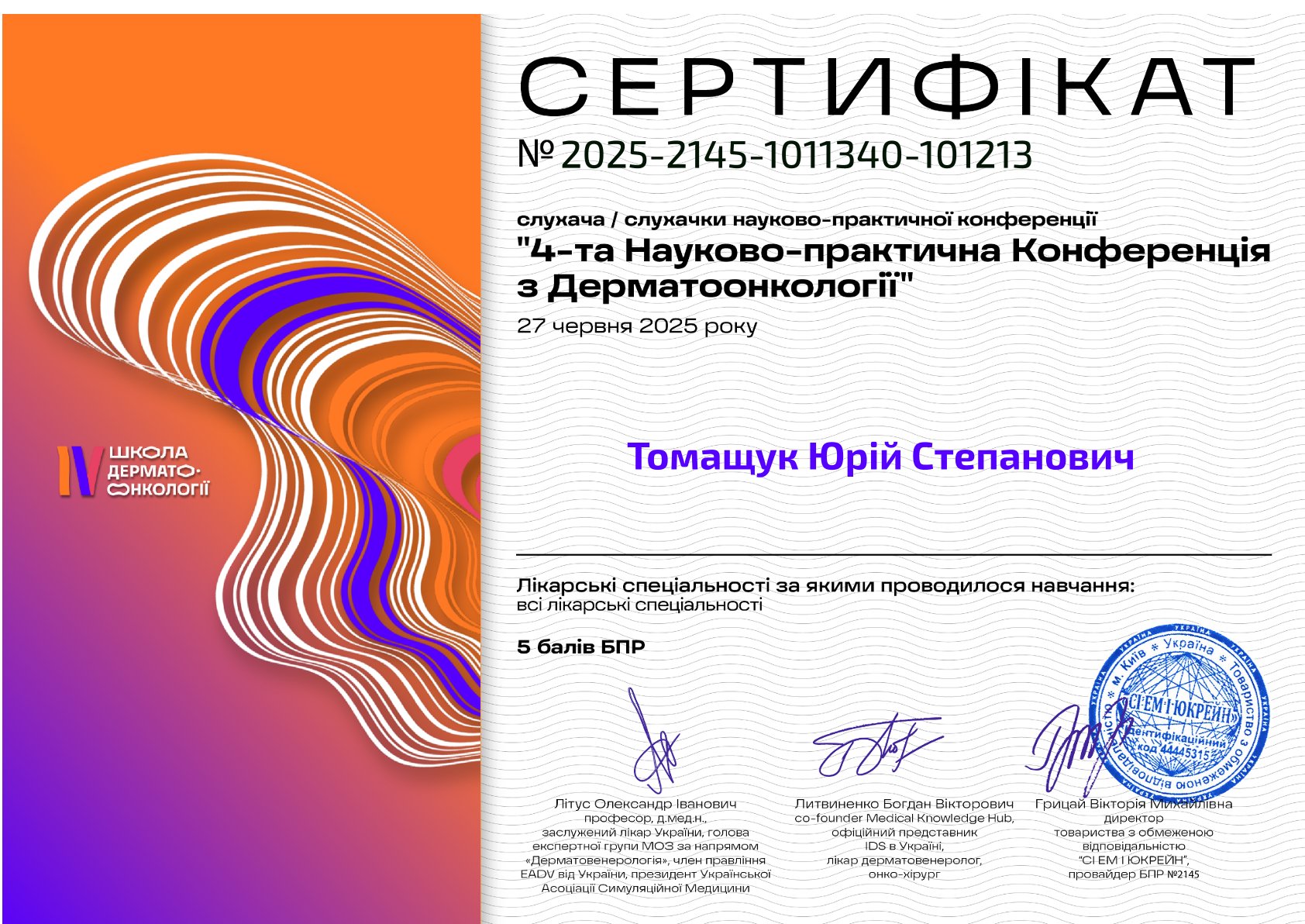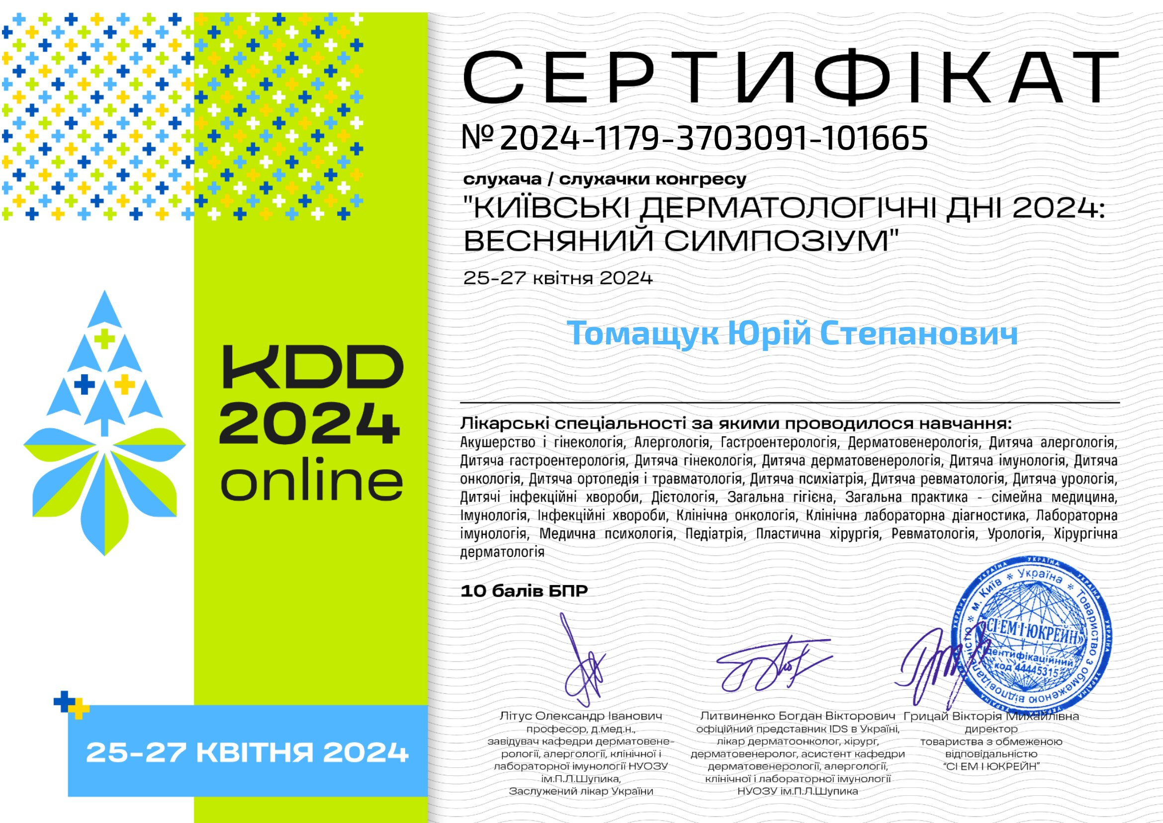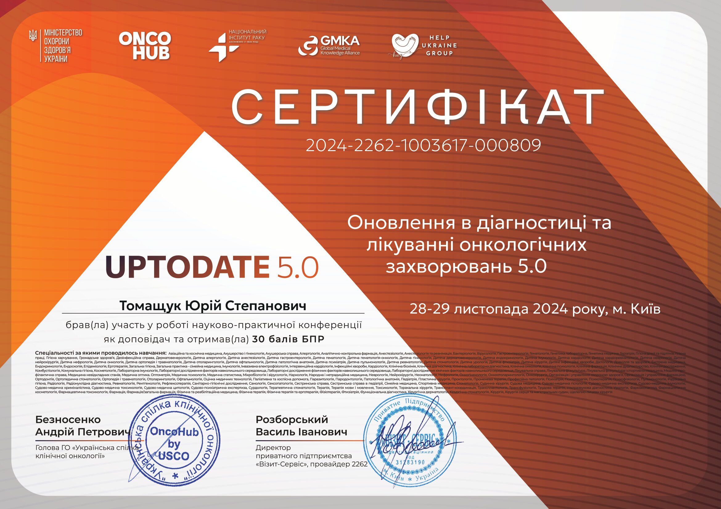 - UPTODATE 5.0 (2024) - участь у навчальному заході/курсі (за наданими даними).