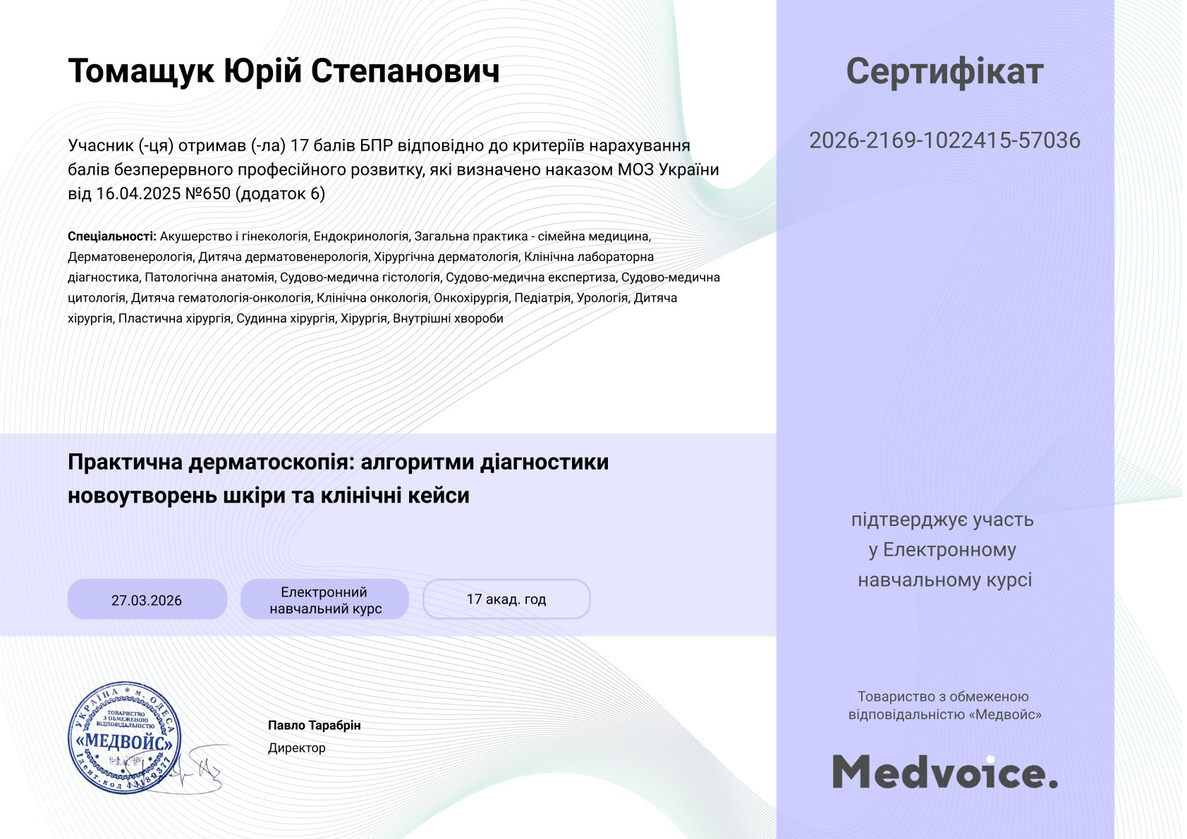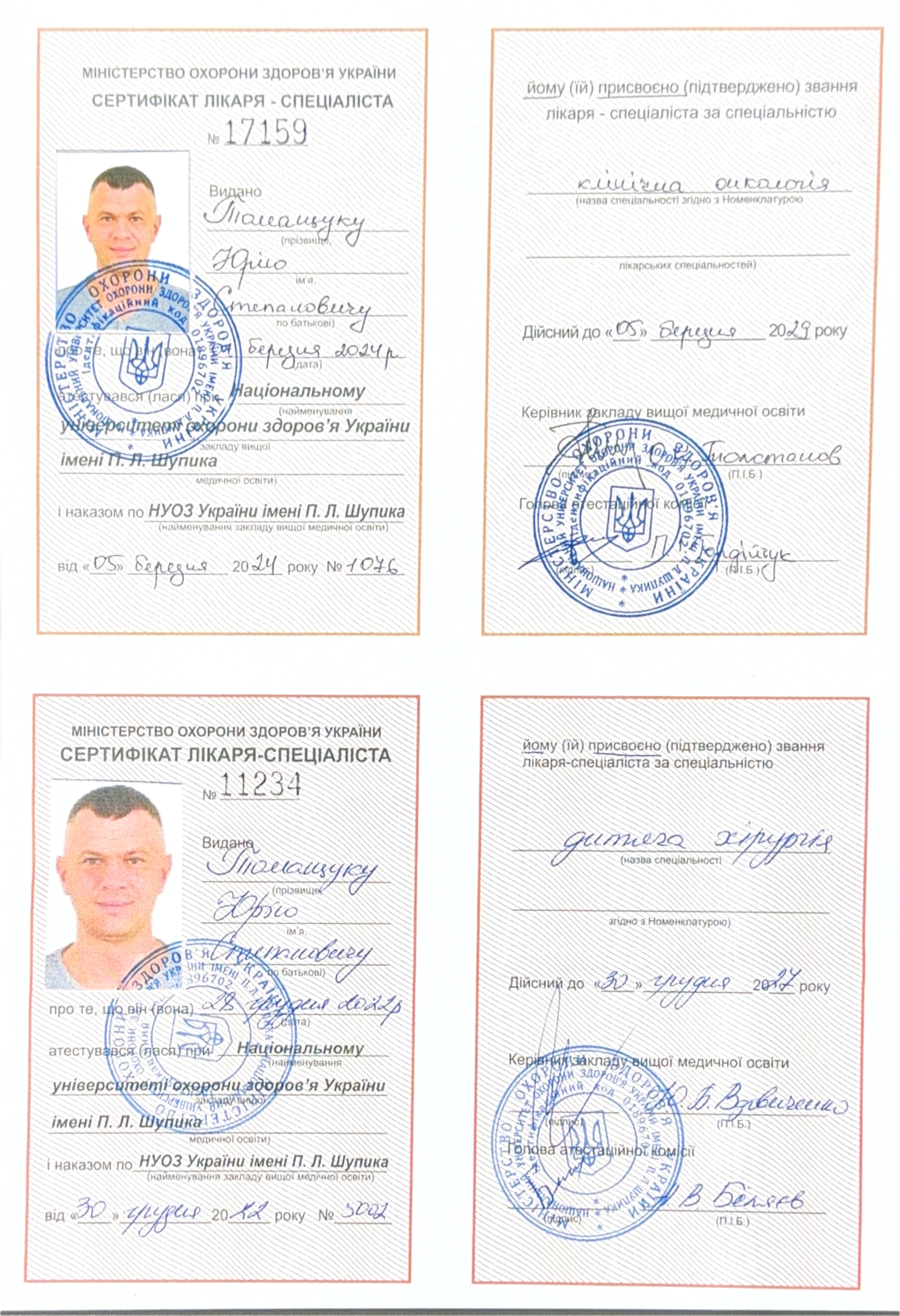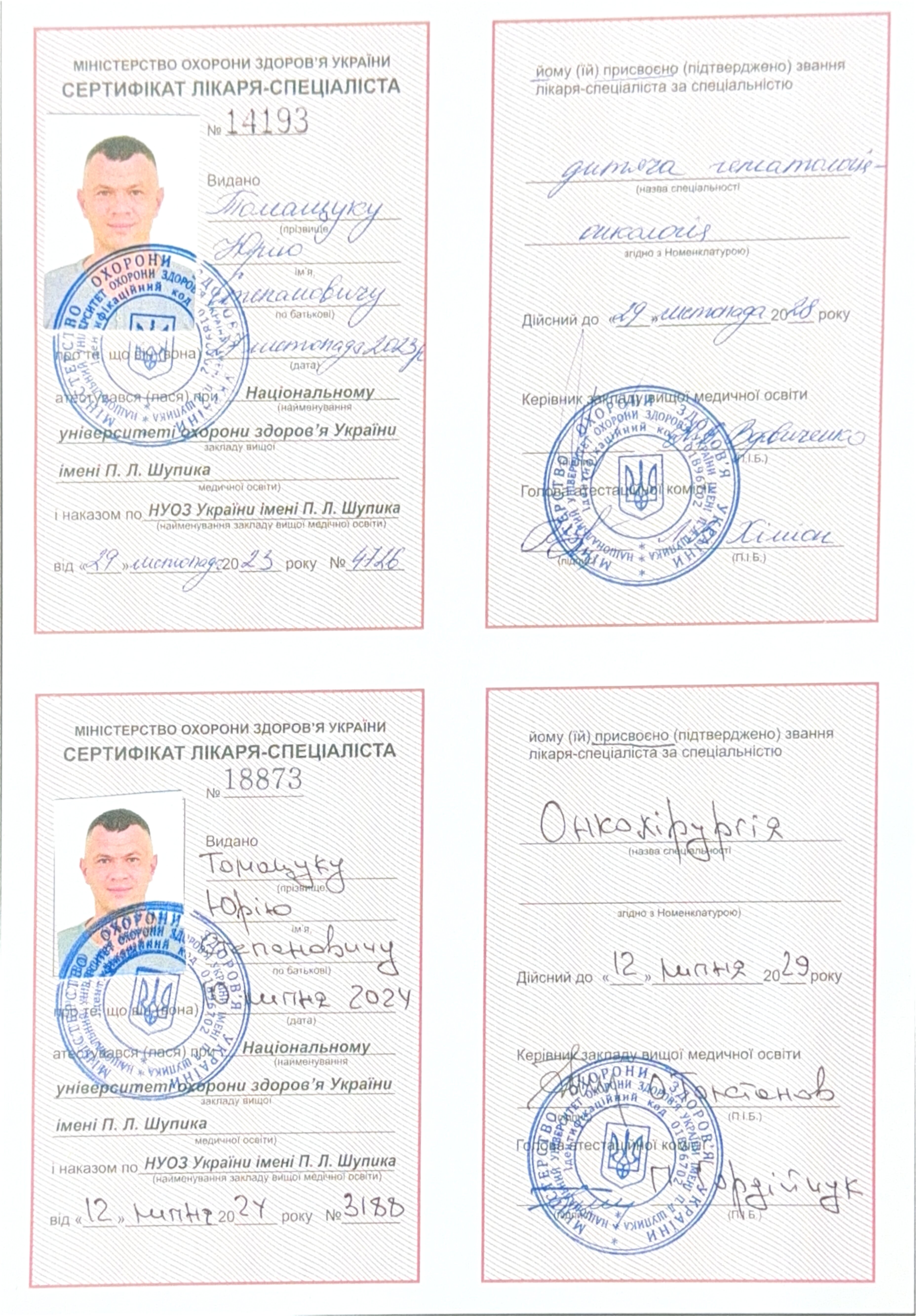 - 12.07.2024 - Національний університет охорони здоров'я України імені П. Л. Шупика: спеціалізація «Онкохірургія».