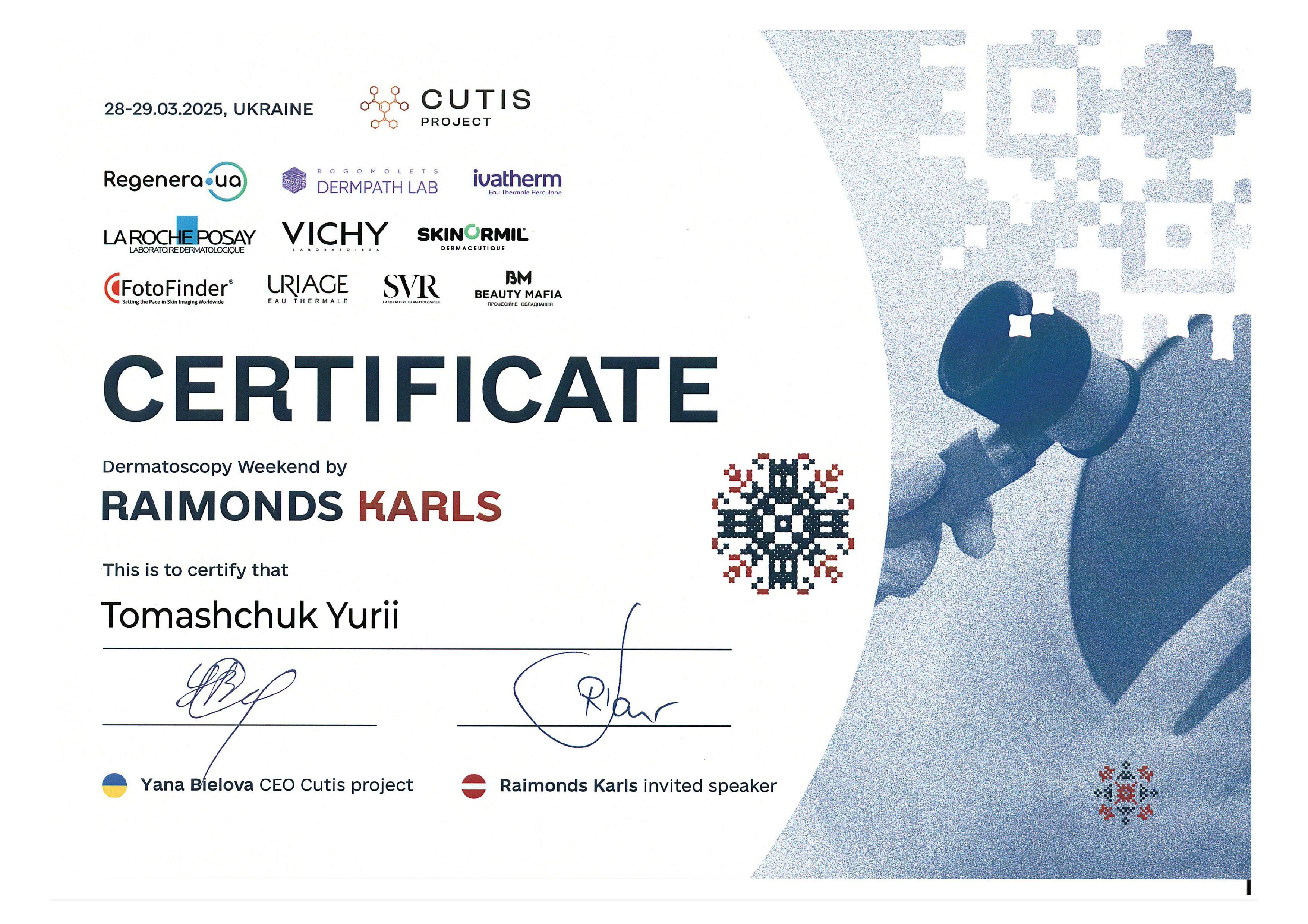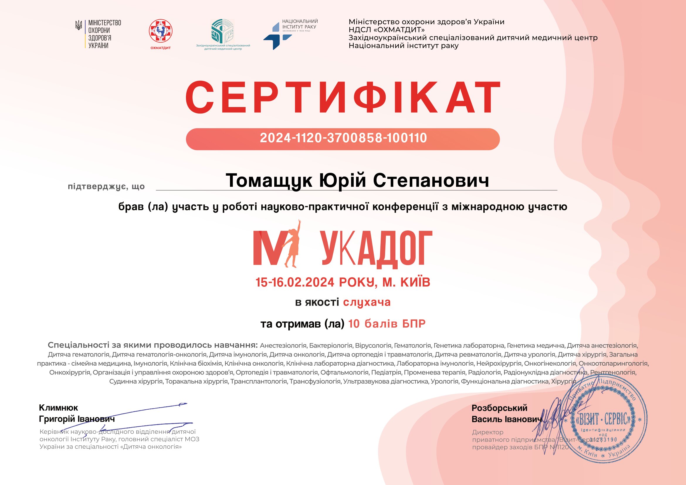 - 29.11.2023 - Національний університет охорони здоров'я України імені П. Л. Шупика: спеціалізація «Дитяча гематологія-онкологія».